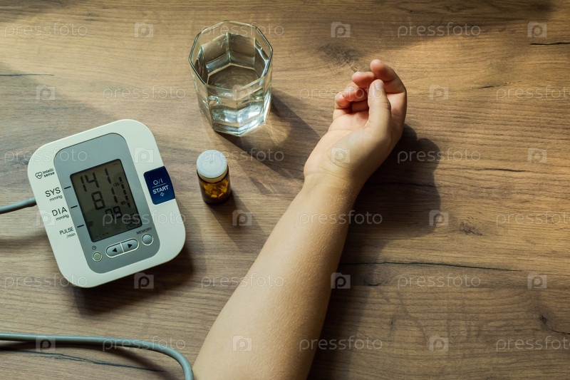 На столе стакан воды, пузырек с таблетками и автоматический тонометр. Женская рука лежит на столе. Экран устройства показывает высокое кровяное давление. Концепция здоровья