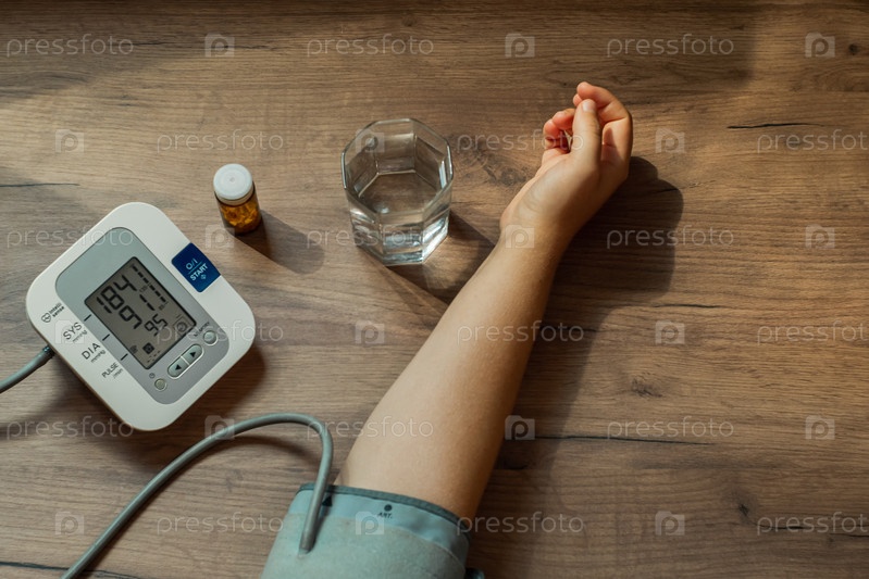 Женская рука, стакан воды, таблетки и автоматический тонометр на деревянном столе. На экране устройства очень высокое давление. Концепция здоровья