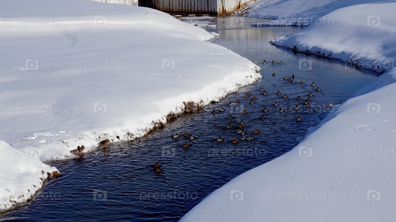 Утки плавают зимой по маленькой реке