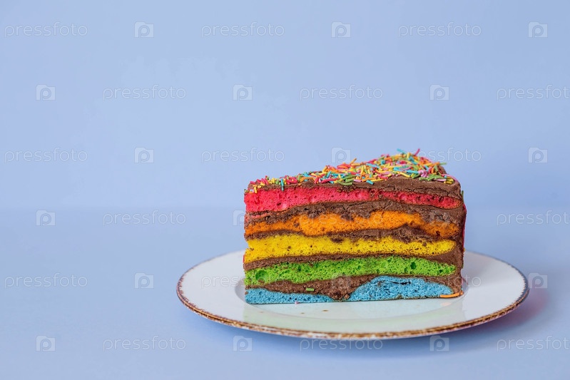 Радужный праздничный торт, украшенный праздничной свечой и конфетти. Кондитерские изделия. Разноцветный десерт цвета радуги на голубом фоне