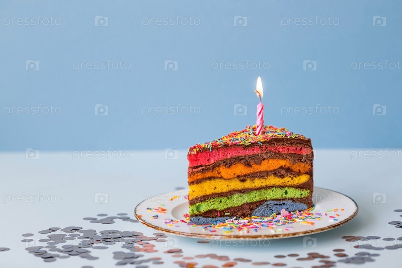 Радужный праздничный торт, украшенный праздничной свечой и конфетти. Кондитерские изделия. Разноцветный десерт цвета радуги на голубом фоне