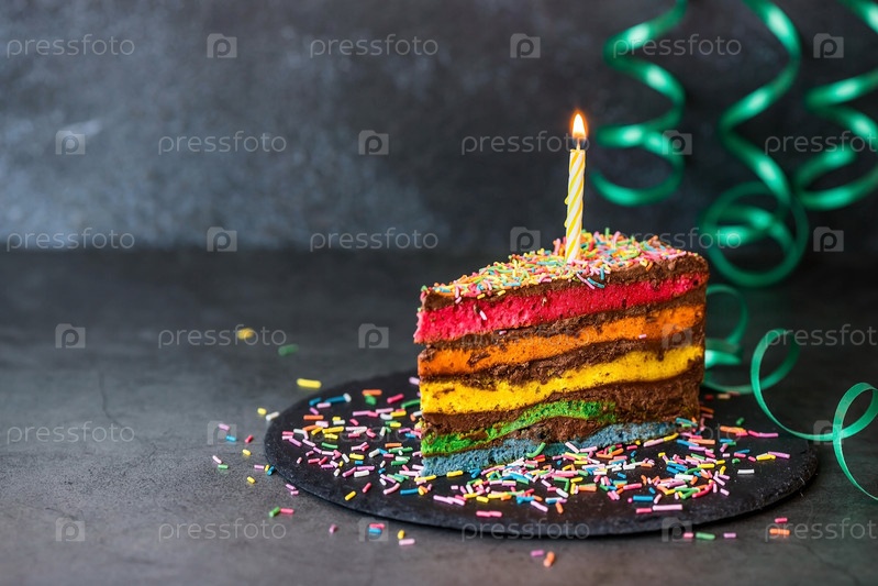 Радужный праздничный торт, украшенный праздничной свечой и конфетти. Кондитерские изделия. Разноцветный десерт цвета радуги на черном фоне
