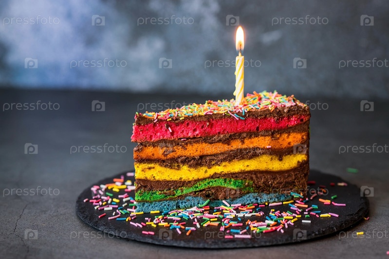 Радужный праздничный торт, украшенный праздничной свечой и конфетти. Кондитерские изделия. Разноцветный десерт цвета радуги на черном фоне