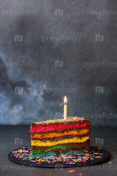 Радужный праздничный торт, украшенный праздничной свечой и конфетти. Кондитерские изделия. Разноцветный десерт цвета радуги на черном фоне