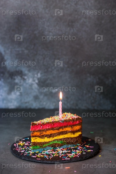 Радужный праздничный торт, украшенный праздничной свечой и конфетти. Кондитерские изделия. Разноцветный десерт цвета радуги на черном фоне