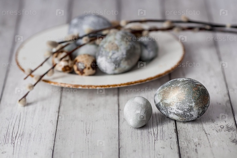 Стильные серые пасхальные яйца цвета мрамора, бетона в тарелке и ветвей ивы на белом деревянном фоне. Окрашивание яиц натуральным красителем каркаде чай. Экологичность. Естественность. Праздник светлой Пасхи