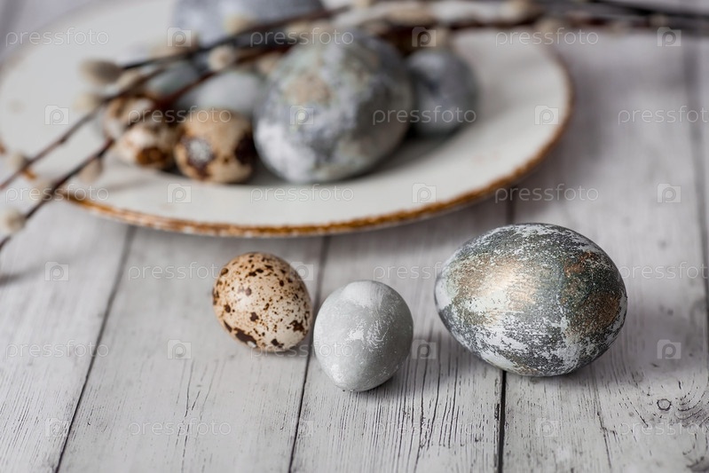 Стильные серые пасхальные яйца цвета мрамора, бетона в тарелке и ветвей ивы на белом деревянном фоне. Окрашивание яиц натуральным красителем каркаде чай. Экологичность. Естественность. Праздник светлой Пасхи
