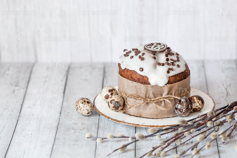 Стильные пасхальные перепелиные яйца, ветки ивы и кулич на белом деревянном фоне. Окрашивание яиц натуральным красителем каркаде чай. Экологичность. Естественность. Праздник светлой Пасхи