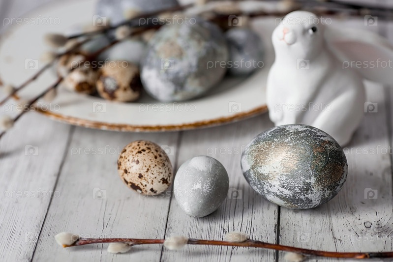 Стильные серые пасхальные яйца цвета мрамора, бетона в тарелке и ветвей ивы на белом деревянном фоне. Окрашивание яиц натуральным красителем каркаде чай. Экологичность. Естественность. Праздник светлой Пасхи