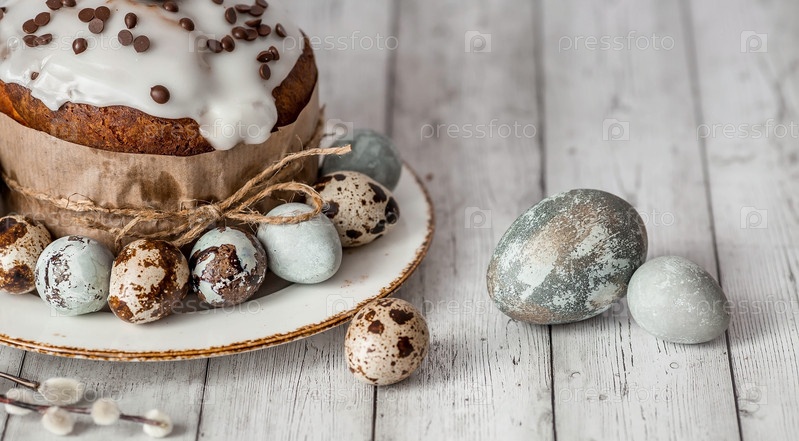 Стильные серые пасхальные яйца цвета мрамора, бетона, ивовых ветвей и пасхального кулича на белом деревянном фоне. Окрашивание яиц натуральным красителем каркаде чай. Экологичность. Естественность. Праздник светлой Пасхи