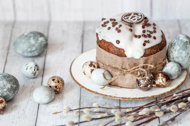Стильные серые пасхальные яйца цвета мрамора, бетона, ивовых ветвей и пасхального кулича на белом деревянном фоне. Окрашивание яиц натуральным красителем каркаде чай. Экологичность. Естественность. Праздник светлой Пасхи