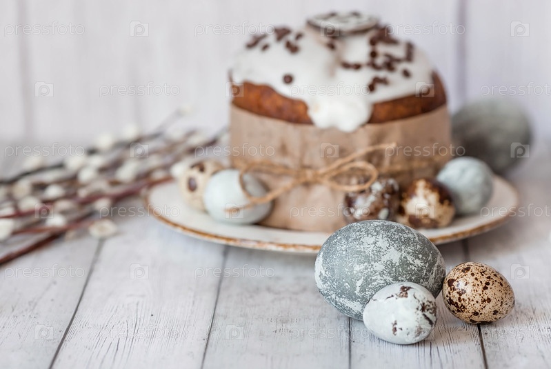 Стильные серые пасхальные яйца цвета мрамора, бетона, ивовых ветвей и пасхального кулича на белом деревянном фоне. Окрашивание яиц натуральным красителем каркаде чай. Экологичность. Естественность. Праздник светлой Пасхи