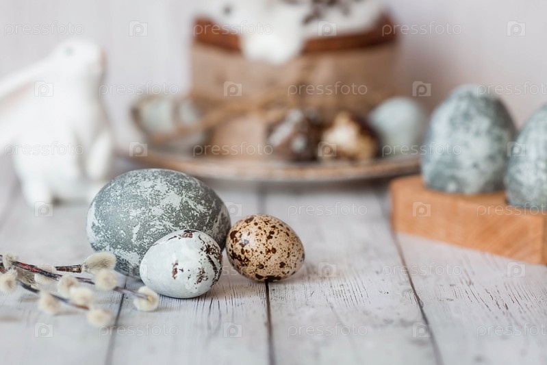 Стильные серые пасхальные яйца цвета мрамора, бетона, ивовых ветвей и пасхального кулича на белом деревянном фоне. Окрашивание яиц натуральным красителем каркаде чай. Экологичность. Естественность. Праздник светлой Пасхи