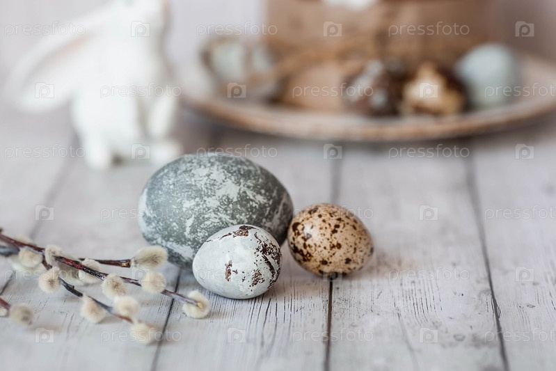 Стильные серые пасхальные яйца цвета мрамора, бетона, ивовых ветвей и пасхального кулича на белом деревянном фоне. Окрашивание яиц натуральным красителем каркаде чай. Экологичность. Естественность. Праздник светлой Пасхи