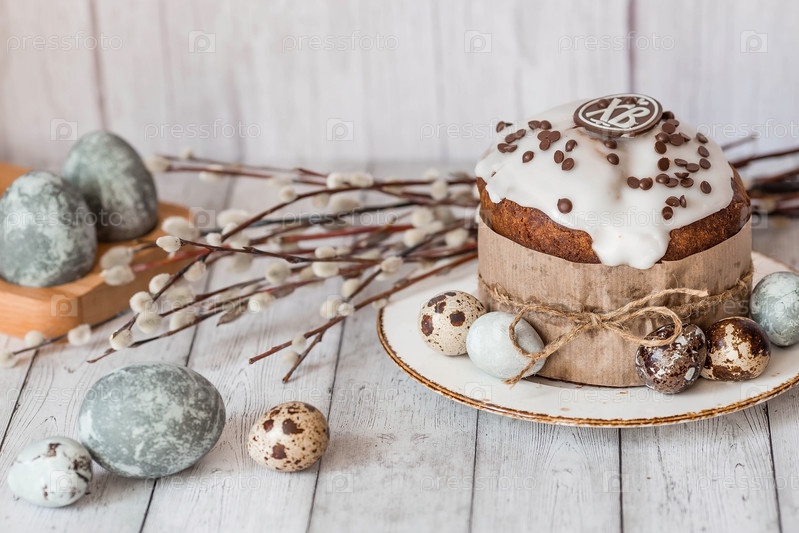 Стильные серые пасхальные яйца цвета мрамора, бетона, ивовых ветвей и пасхального кулича на белом деревянном фоне. Окрашивание яиц натуральным красителем каркаде чай. Экологичность. Естественность. Праздник светлой Пасхи