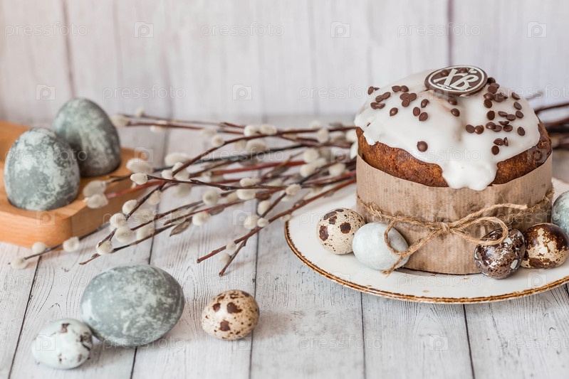 Стильные серые пасхальные яйца цвета мрамора, бетона, ивовых ветвей и пасхального кулича на белом деревянном фоне. Окрашивание яиц натуральным красителем каркаде чай. Экологичность. Естественность. Праздник светлой Пасхи