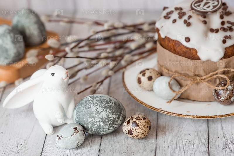 Стильные серые пасхальные яйца в цветах мрамора, бетона, ивовых ветвей, пасхальных кроликов и пасхального кулича на белом деревянном фоне. Окрашивание яиц к Пасхе. Экологичность. Естественность. Праздник светлой Пасхи