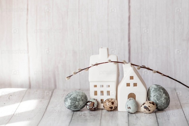 Стильные серые пасхальные яйца в цветах мрамора, бетона, ветвей ивы и белых домов в скандинавском стиле на белом деревянном фоне. Окрашивание яиц. Экологичность. Праздник светлой Пасхи