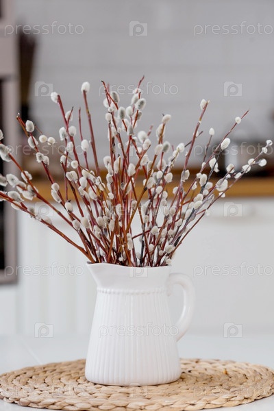 Букет из веточек вербы к православному празднику Вербное воскресенье. Верба в белом кувшине в интерьере современной белой кухни