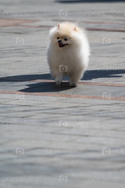 Белая померанская собака гуляет по улице в городе