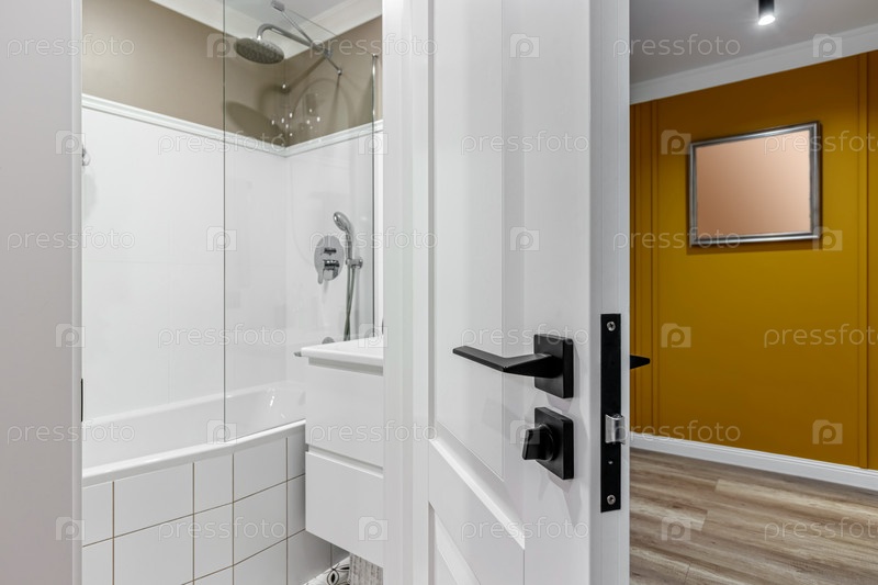 Вход в ванную комнату с белой дверью и черной ручкой на переднем плане