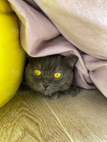 Серый кот прячется под одеялом на полу