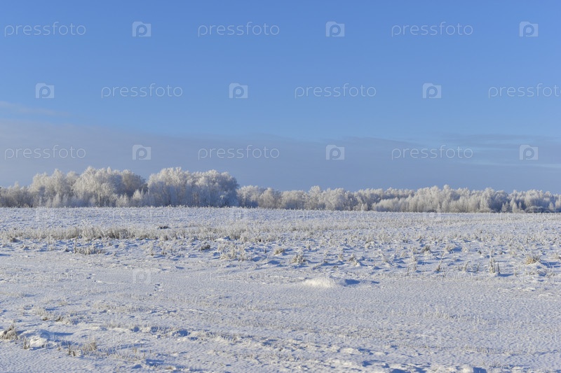 Заснеженное поле зимой, голубое небо и лес. Снег в зимнем поле днем