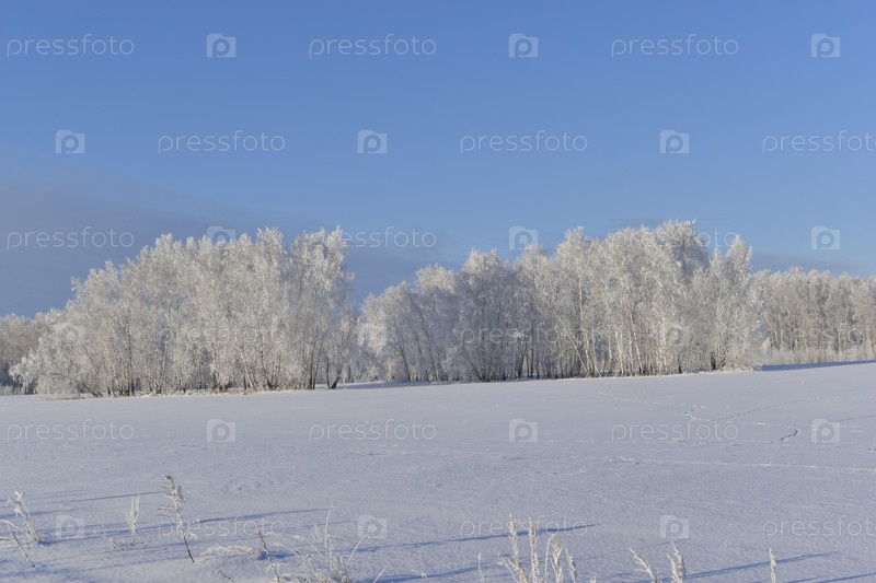 Заснеженное поле зимой, голубое небо и лес. Снег в зимнем поле днем