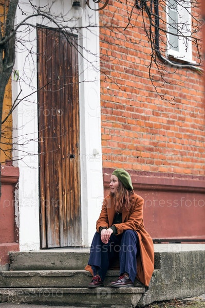 Портрет молодой женщины старше 30 лет в берете и стильном пальто, девушка гуляет по городу ранней весной. Современный образ жизни