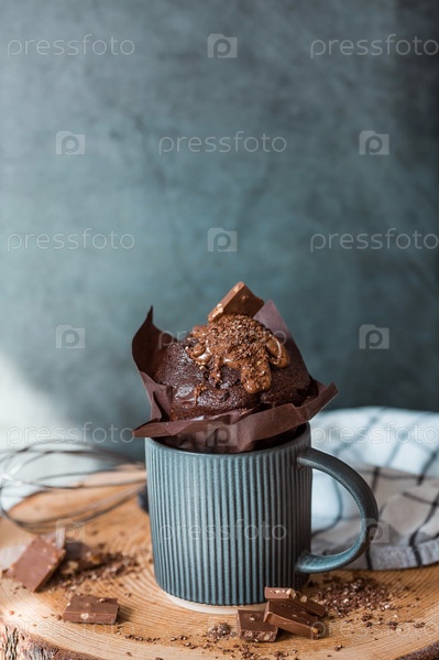 Вкусные свежеиспеченные шоколадные кексы на темном фоне. Вкусный кекс крупным планом. Контекст пекарни с выпечкой. Кондитерские изделия