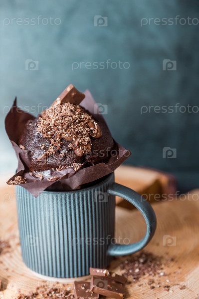 Вкусные свежеиспеченные шоколадные кексы на темном фоне. Вкусный кекс крупным планом. Контекст пекарни с выпечкой. Кондитерские изделия