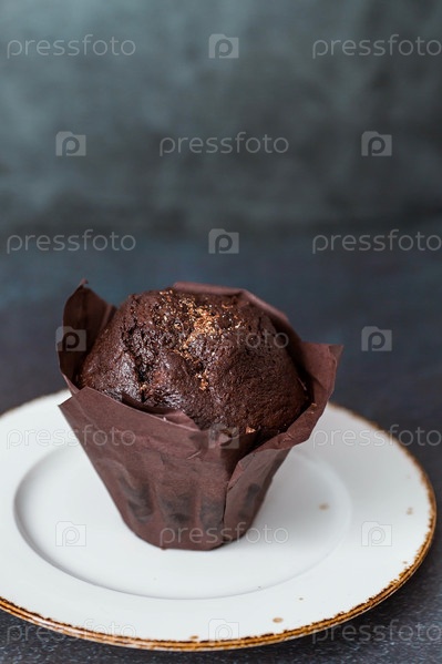 Вкусные свежеиспеченные шоколадные кексы на темном фоне. Вкусный кекс крупным планом. Контекст пекарни с выпечкой. Кондитерские изделия