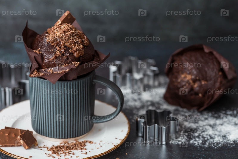 Вкусные свежеиспеченные шоколадные кексы на темном фоне. Вкусный кекс крупным планом. Контекст пекарни с выпечкой. Кондитерские изделия