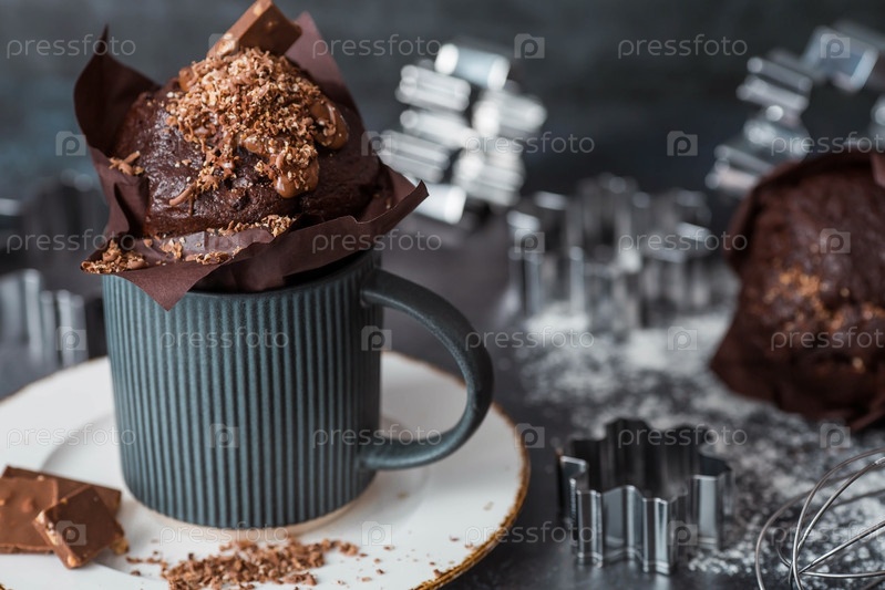 Вкусные свежеиспеченные шоколадные кексы на темном фоне. Вкусный кекс крупным планом. Контекст пекарни с выпечкой. Кондитерские изделия