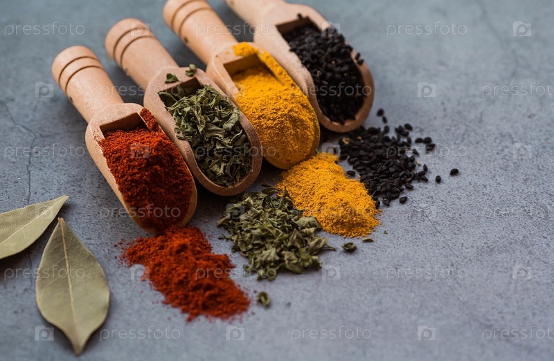 Набор ароматных специй. Куркума, паприка, травы и перец в деревянных ложках на сером фоне. Свободное место для текста