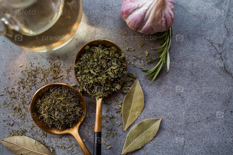 Ароматные специи. Сушеная петрушка, укроп, розмарин, чеснок и лавровый лист на сером фоне. Свободное место
