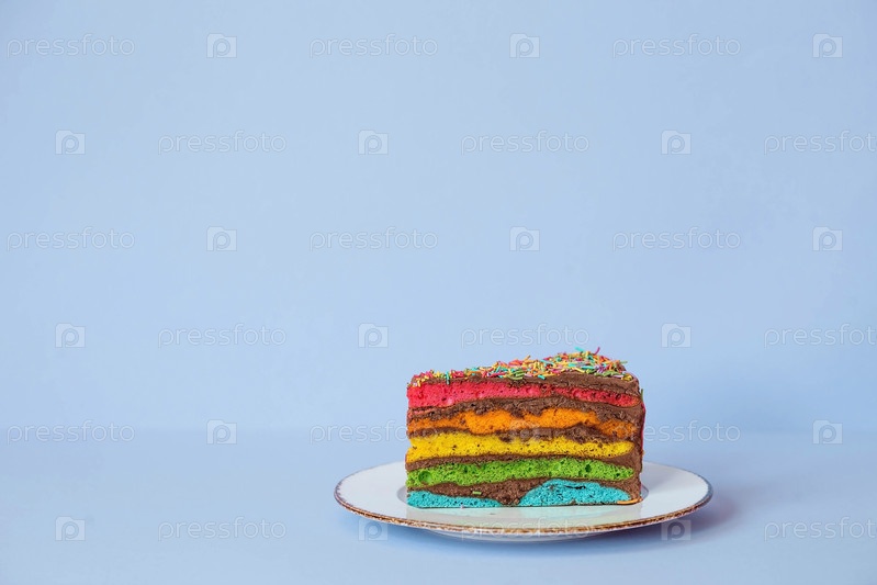Радужный праздничный торт, украшенный праздничной свечой и конфетти. Кондитерские изделия. Разноцветный десерт цвета радуги на голубом фоне