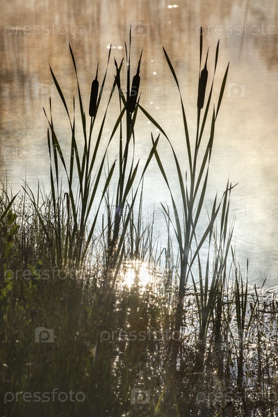 Камыши на озере, природа Карелии, тростники утром на берегу озера