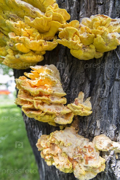 Россия. Санкт-Петербург. Гриб на дереве. Гриб-вредитель трутовик сернисто-желтый. Россия. Санкт-Петербург. A mushroom on a tree. The fungus-pest tinder is sulfur-yellow