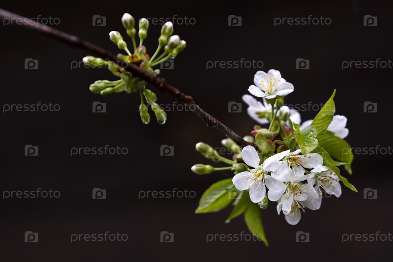 Цветение фруктового дерева. Ветвь цветущей вишневой ветви. Россия. Санкт-Петербург. Цветущее плодовое дерево. Ветка цветения вишни
