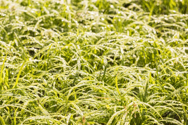 Сочная сочная зеленая трава на лугу с каплями в дождливый день. Естественный летний весенний фон крупным планом, пространство для копирования