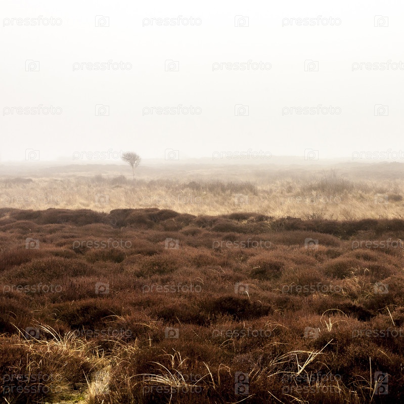 Голое одинокое дерево стоит в утреннем тумане возле пустой проселочной дороги. Остров Тексель, Нидерланды