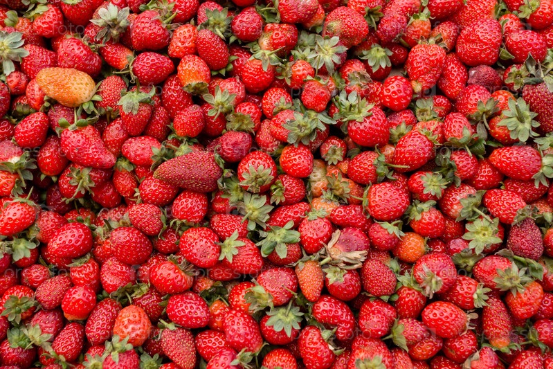 Свежая красная спелая органическая клубника на фермерском рынке. Ягодный фон крупным планом. Здоровая веганская еда