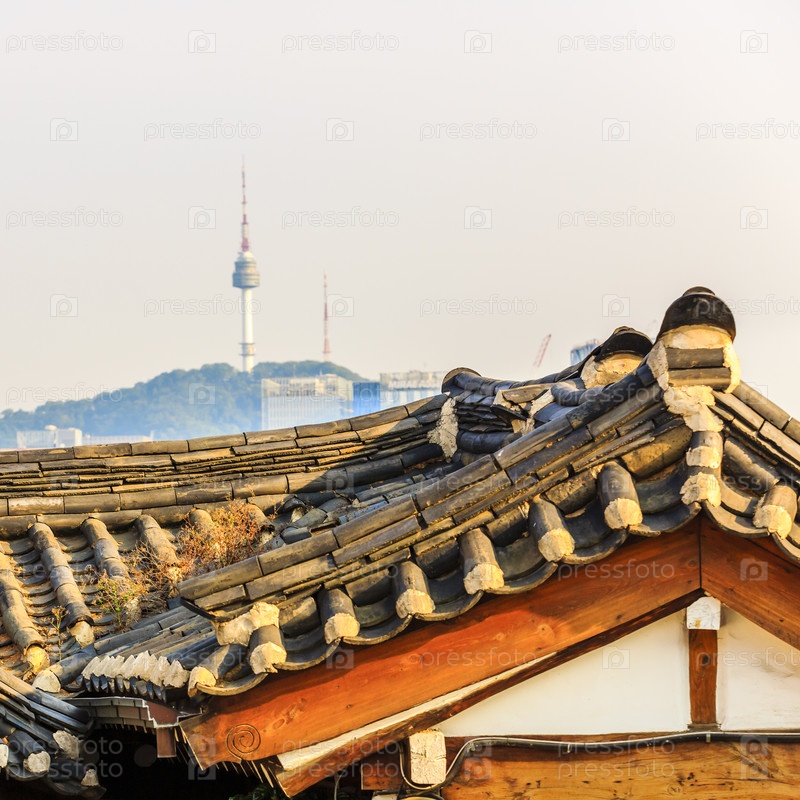 Башня Намсан из деревни Букчон Ханок, Сеул, Южная Корея