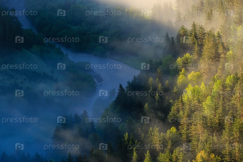 Утренний туман на реке, солнечные лучи пробиваются сквозь туман. Сказочный мистический туманный лес
