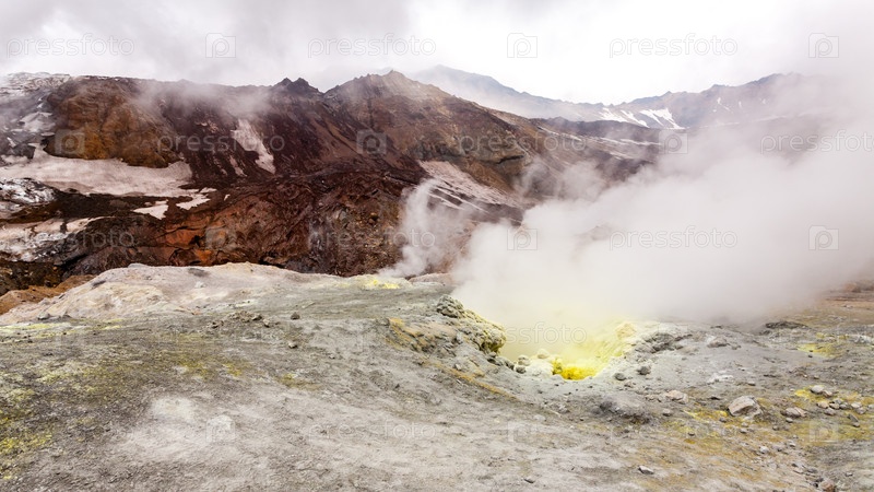 Дымящиеся, серные, действующие фумаролы у вулкана Мутновский, полуостров Камчатка, Россия