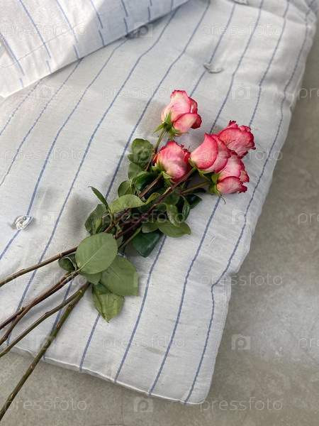 Розовые розы лежат на полу и кровати