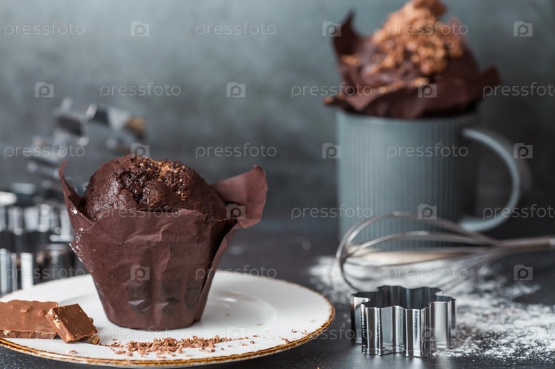 Вкусные свежеиспеченные шоколадные кексы на темном фоне. Вкусный кекс крупным планом. Контекст пекарни с выпечкой. Кондитерские изделия