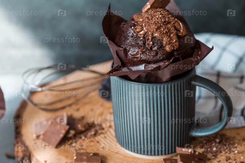 Вкусные свежеиспеченные шоколадные кексы на темном фоне. Вкусный кекс крупным планом. Контекст пекарни с выпечкой. Кондитерские изделия