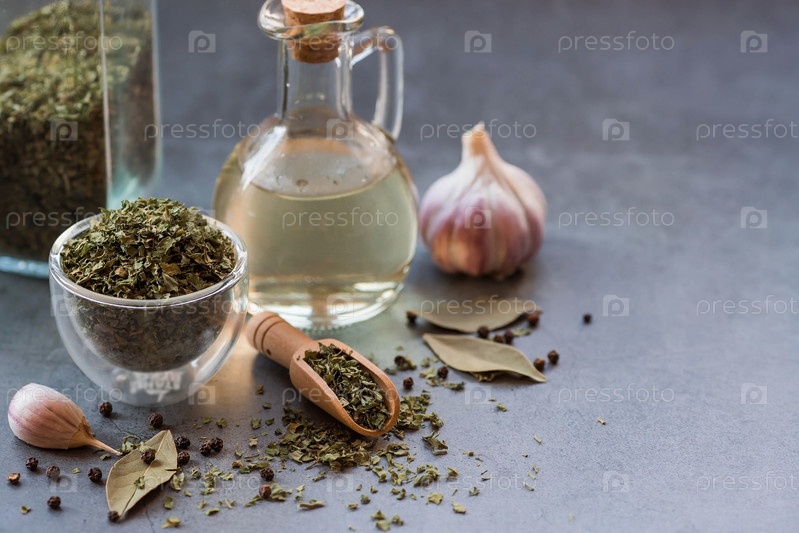 Ароматные специи. Сушеная петрушка, чеснок, лавровый лист, черный перец и бутылка масла на сером фоне. Свободное место